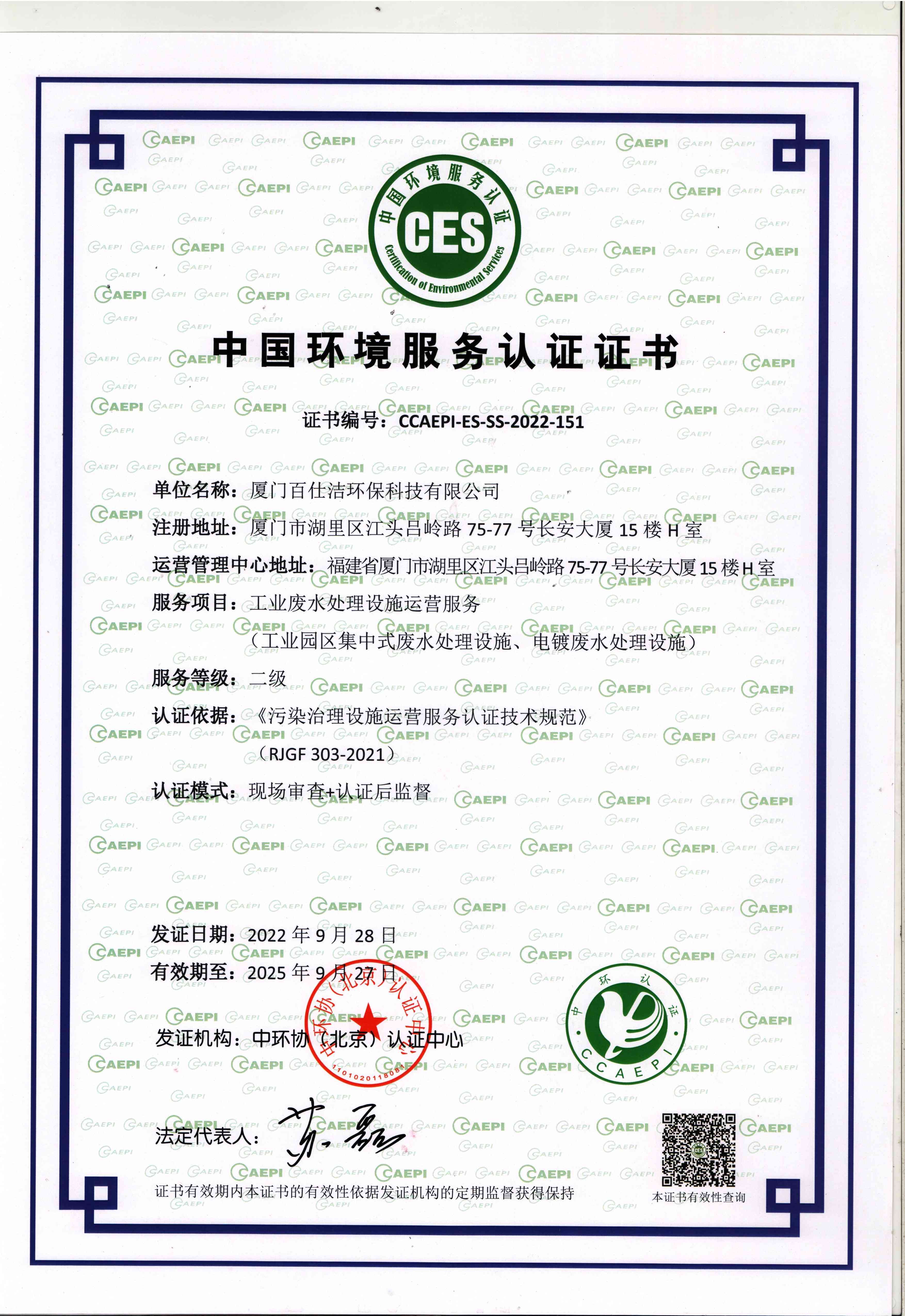 中國環(huán)境服務認證證書